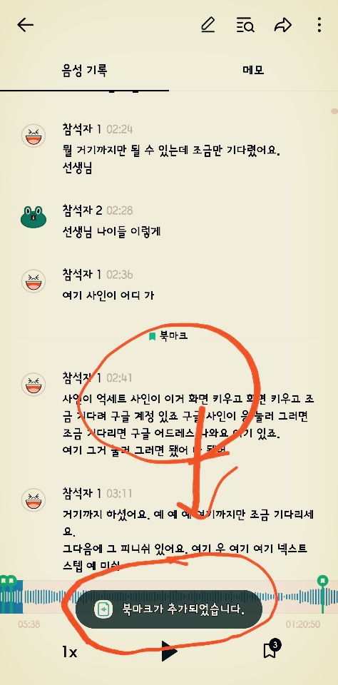 녹취 중 표식을 달 부분 대화를 선택해서 롱탭을 합니다. 팝업메뉴가 나옵니다. 그중 '북마크 추가'를 택합니다.