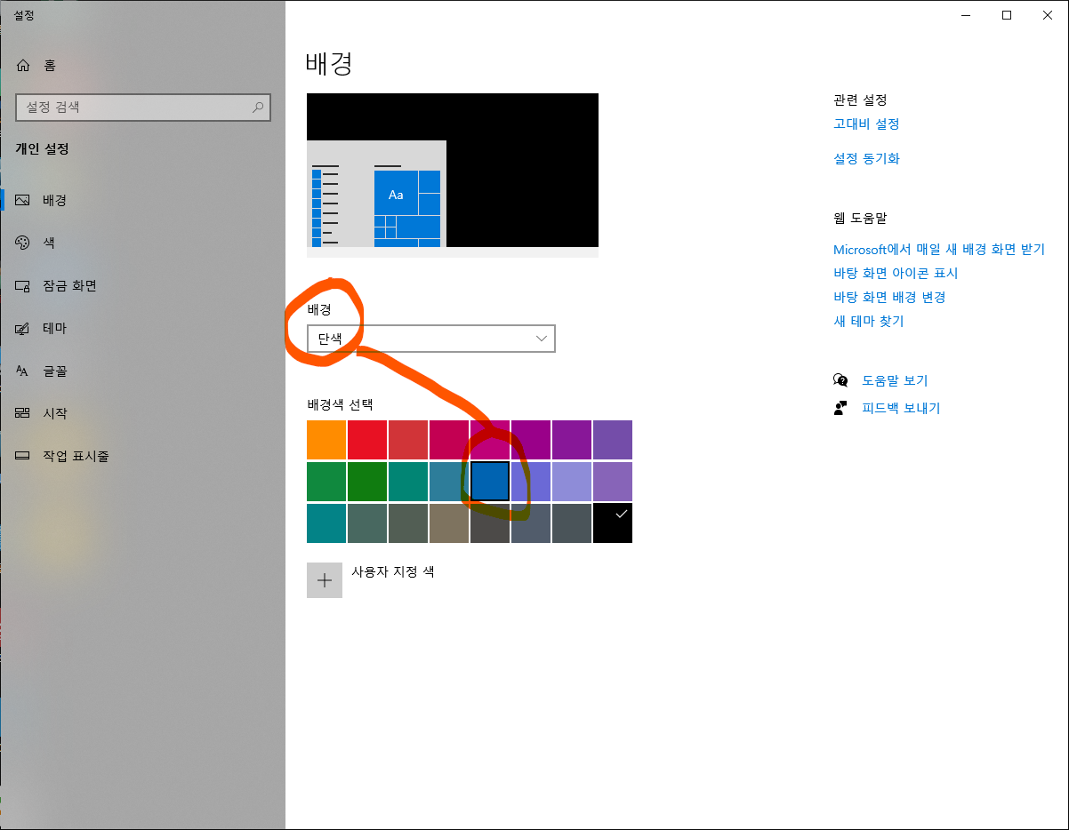 배경을 사진에서 '단색'으로 바꾸고 배경색을 선택합니다. 저는 남색을 선택했습니다. 비교적 어두운 색이 아이콘을 구별이 쉽기 때문입니다. 너무 어두우면 분위기마저 가라앉는 것 같아서 진한 남색을 선택합니다.