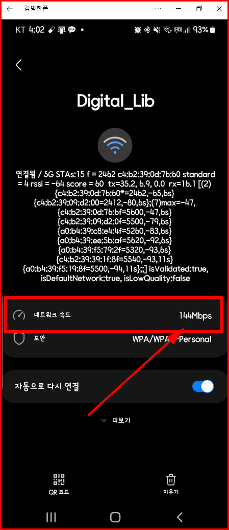 사용이 가능한 와이파이가 여럿 있을 때에는 속도를 비교해서 빠른 와이파이를 연결하는 것이 좋겠네요. 아래 경우는 초당 144메가바이트 속도를 나타내고 있네요.