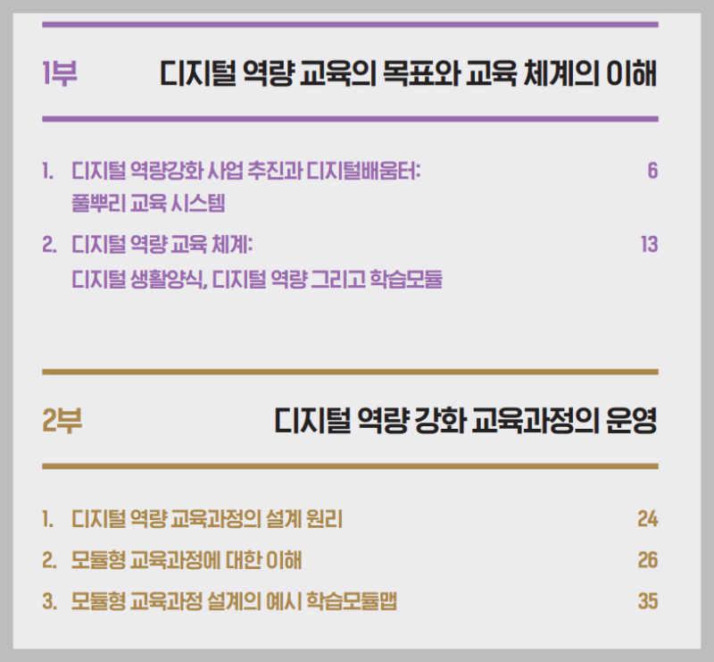 이 책은 2020년 실시된 「전 국민 디지털 역량강화 교육을 위한 역량별·수준별 교육과정 개발」 연구를 토대로 디지털배움터에서의 교육에 관심을 가지고 있는 사람들을 위해 저술된 것이다. 2021년 디지털배움터의 학습자 5622명을 대상으로 요구조사를 추가로 실시하여 학습자의 특성을 고려한 학습모듈 경로 맵을 예시로 제시하여 모듈형 교육과정의 장점을 이해하고 현장에서 유용하게 활용할 수 있도록 제안하였다. 디지털배움터에서의 교육은 지속가능해야 하며 학습자 중심으로 설계되어 학습자의 변화를 이끌어내야 한다. 디지털배움터를 통해 더 많은 사람들이 디지털 세상의 혜택을 고루 누리며 살아갈 때, 우리 사회는 혁신적 포용국가로 한 발자국 더 나아갈 수 있을 것으로 기대된다.