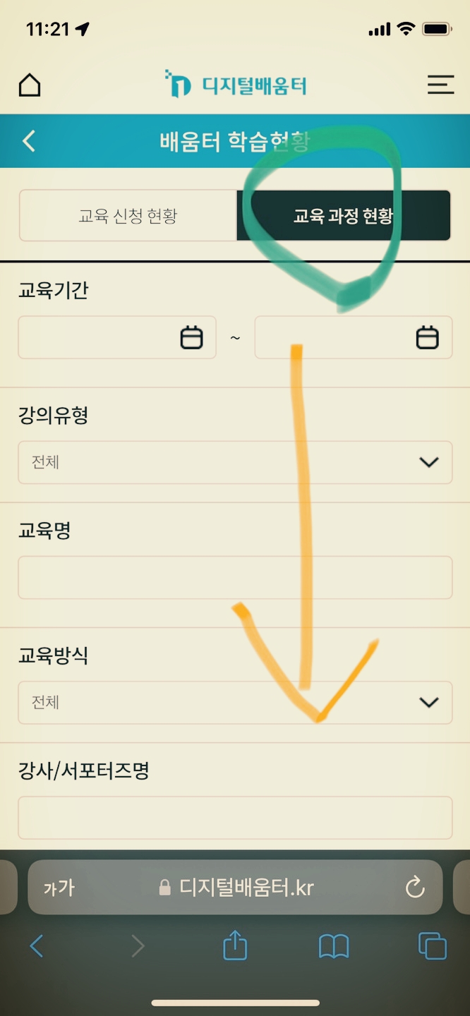 교육과정 현황에서 화면을 아래로 훑어 내려가면 교육받는 날 출결이 나옵니다. 그 '출결'을 선택합니다.