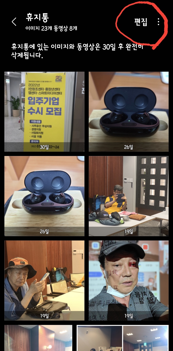갤러리 휴지통입니다. 비우려면 '점세개'를 눌러 '비우기'를 선택하면 개운하게 정리됩니다. 그러나 선택적으로 지우거나 복원할 때는 편집을 선택합니다.