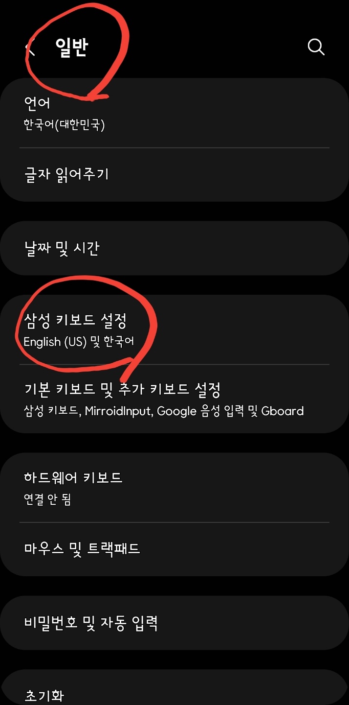 '설정 > 일반'에서 '삼성 키보드'를 찾습니다. 물론 안드로이드 삼성폰의 경우입니다.