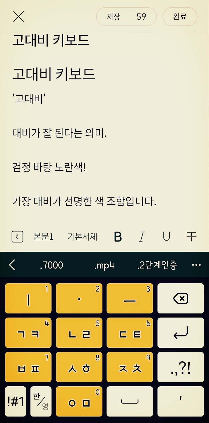가장 대비가 선명한 색 조합입니다. 제가 사용 중인 고대비 화상키보드입니다. 약간의 키 진동은 손맛을 느낄 수 있어 좋네요. 사실 책상에 앉아 키보드 때리는 것보다 누워서 화상 키패드 때리는 경우가 더 많아졌습니다.