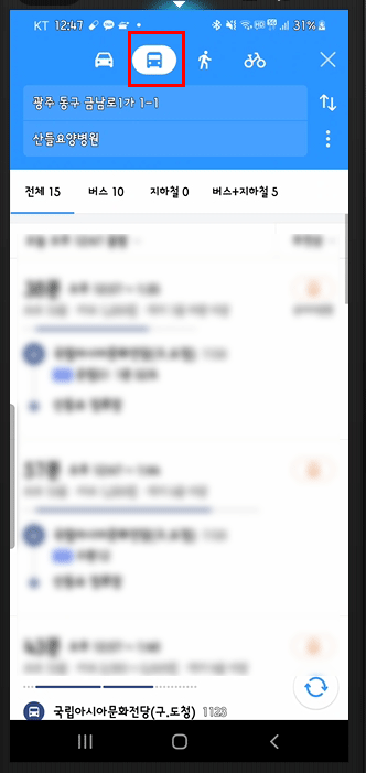 물론 승용차나 자전거를 선택할 수도 있습니다. 걸을 때는 [걷기]를 선택하구요. [대중교통] 중에서도 버스만 이용할 것이라면 [전체]가 아닌 [버스]를 선택해서 선택지를 줄일 수도 있습니다.