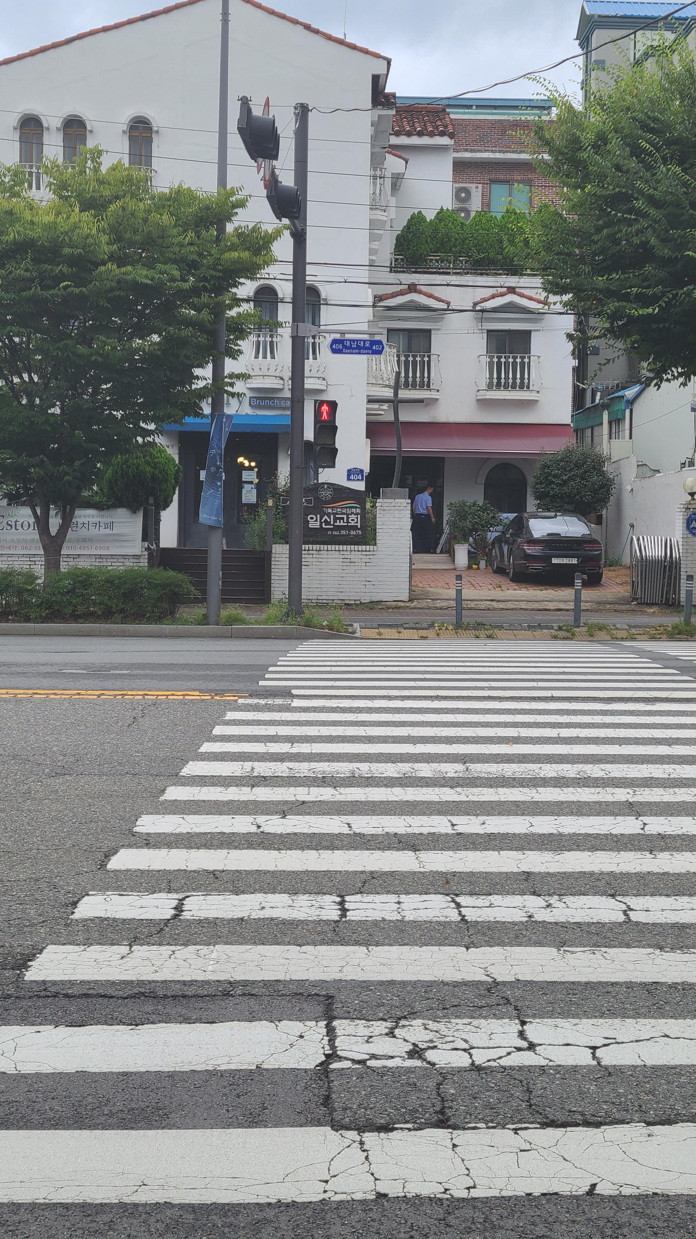 횡단보도에서 길을 향해 서서 도로 저편을 보고 스마트폰을 그쪽으로 향한 상태를 보여주는 겁니다. 길을 건너면 좌로 틀어 두 블록을 지나면 버스정류소가 나오는 것을 알 수 있네요.