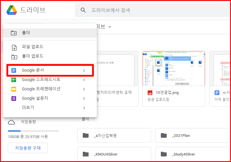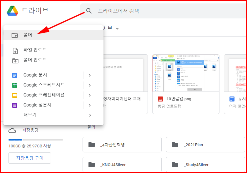 구글 드라이브에 폴더가 필요한 경우 [새로 만들기]를 선택하여 '폴더'를 택합니다. 이름을 주고 확인을 거치면 새로운 이름의 폴더가 만들어집니다.