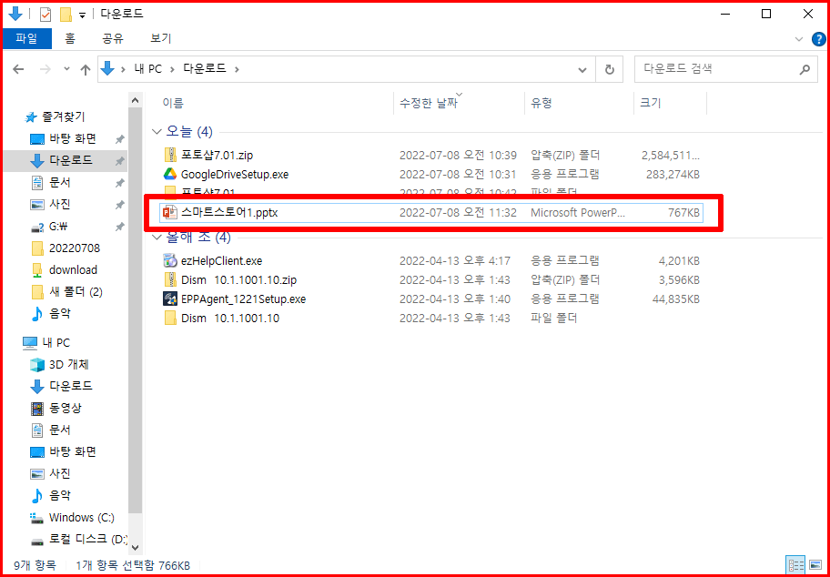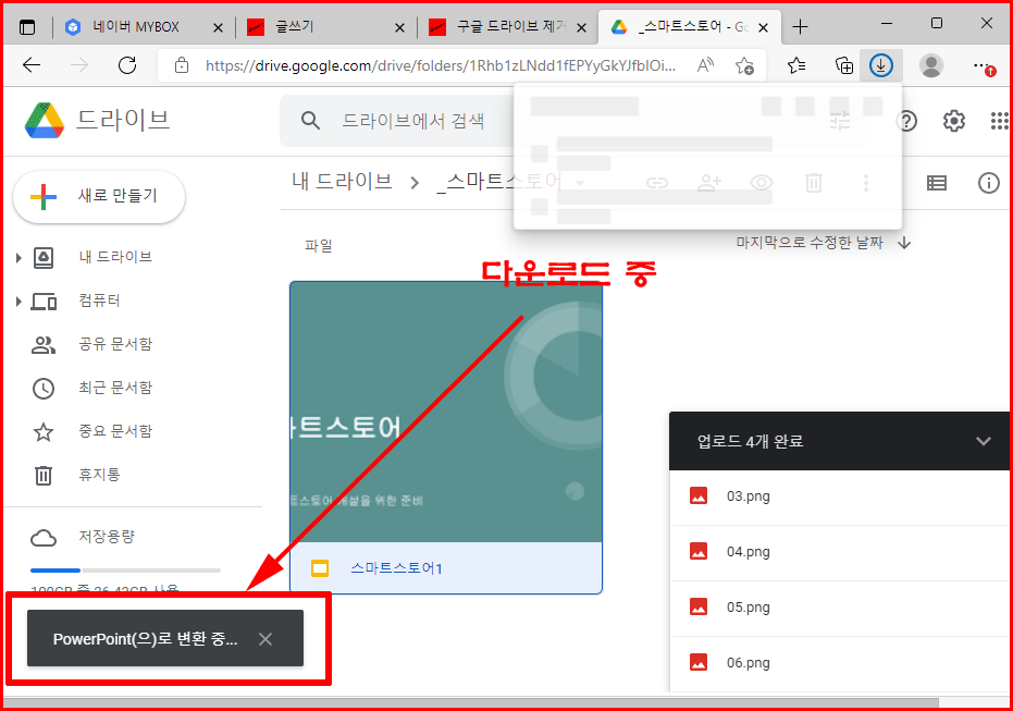 작성된 프레젠테이션 '스마트스토어'를 내려받는 과정입니다. 윈도우 컴퓨터를 통해 내려받기 때문에 파워포인트로 변환하여 다운로드가 됩니다.