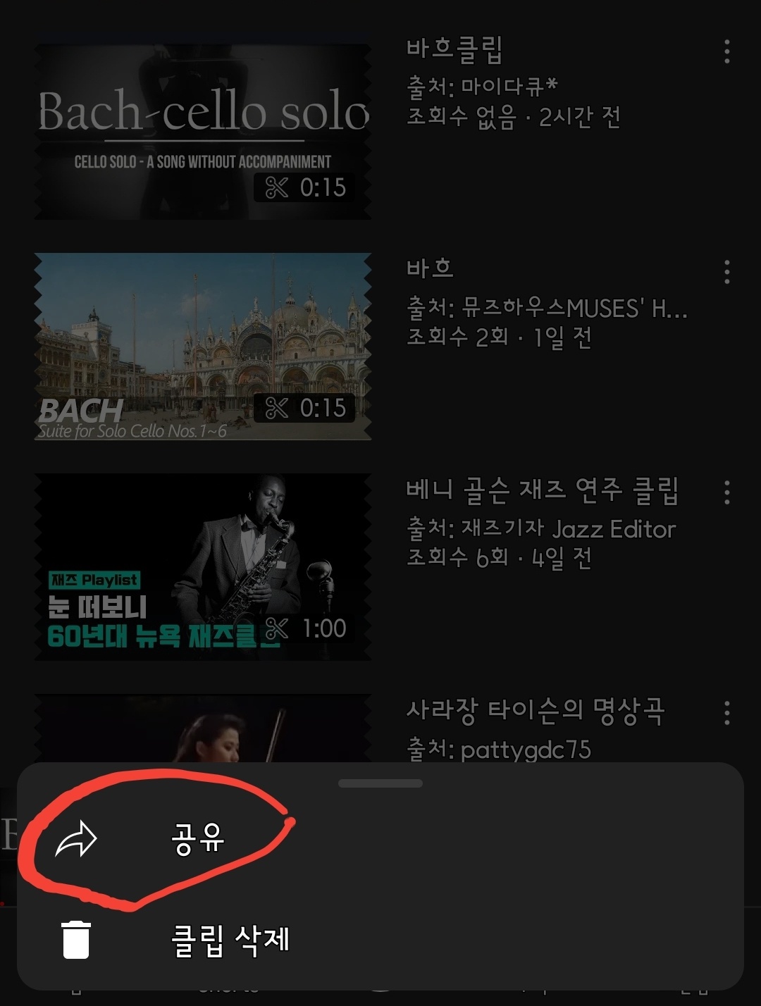 '내 클립'을 확인하면 최신 클립이 위에 배치된다. '삼 점 더보기'를 열면 공유와 완전 삭제를 선택할 수 있다. 불 필요한 클립은 삭제하면 끝.