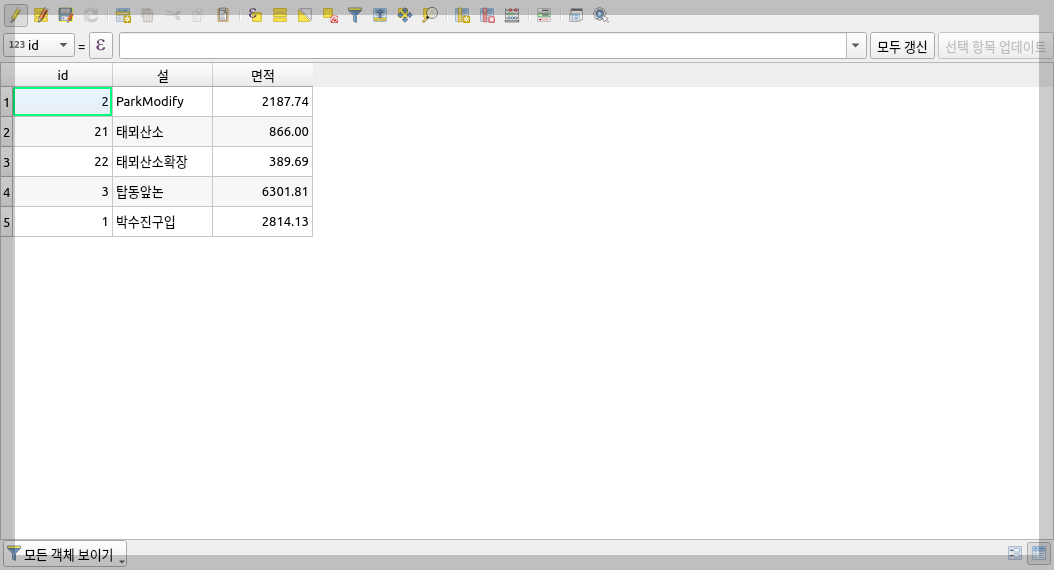 '평' 단위의 계산은 계산된 면적 '$area'를 3.306으로 나누는 간편 방식을 썼습니다. '$area/3.306' 이렇게요. 하나의 레코드에 NULL 값이 생긴 것은 임의로 객체 하나를 추가하면서 발생된 현상입니다. '면적환산' 필드 계산에서 임의로 작성된 레코드는 계산에서 제외됐습니다. 나중 학습에 참고할 것 같아 그대로 남겼습니다.