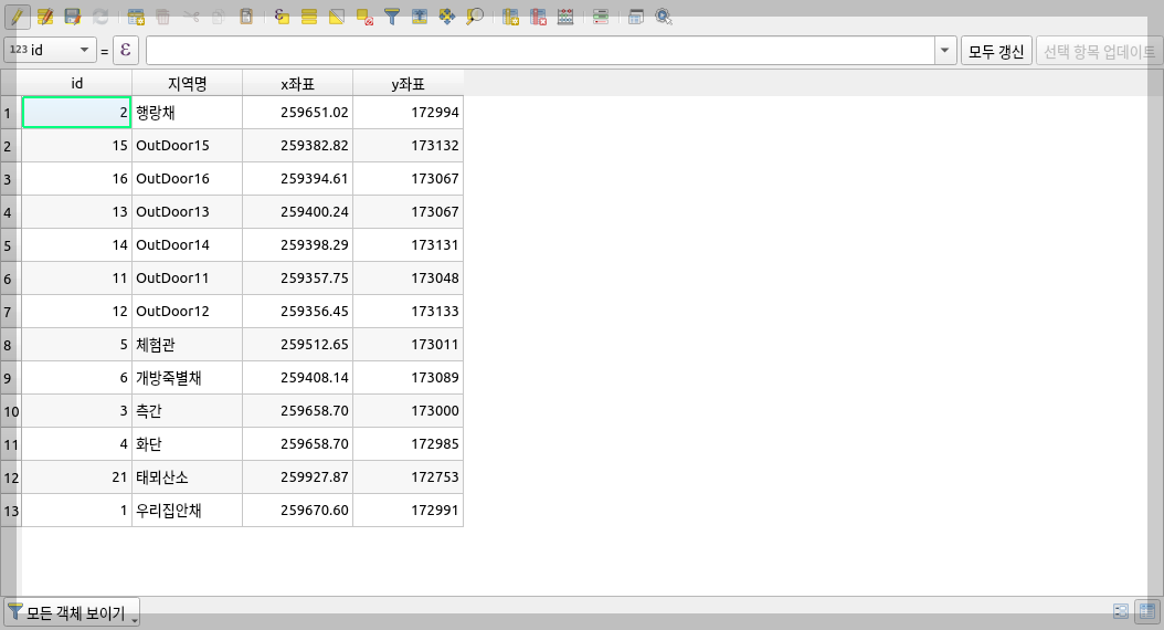 '점 레이어'에는 필요한 지점에 포인트 13개를 만들었습니다. 각각의 x, y좌표값을 얻고 거기에 관한 간단한 설명도 붙였습니다. 가옥은 객체의 가운데를 대략 짐작으로 추측해서 정했습니다.