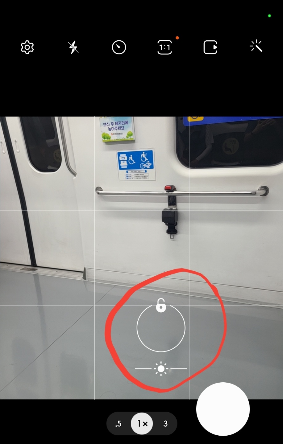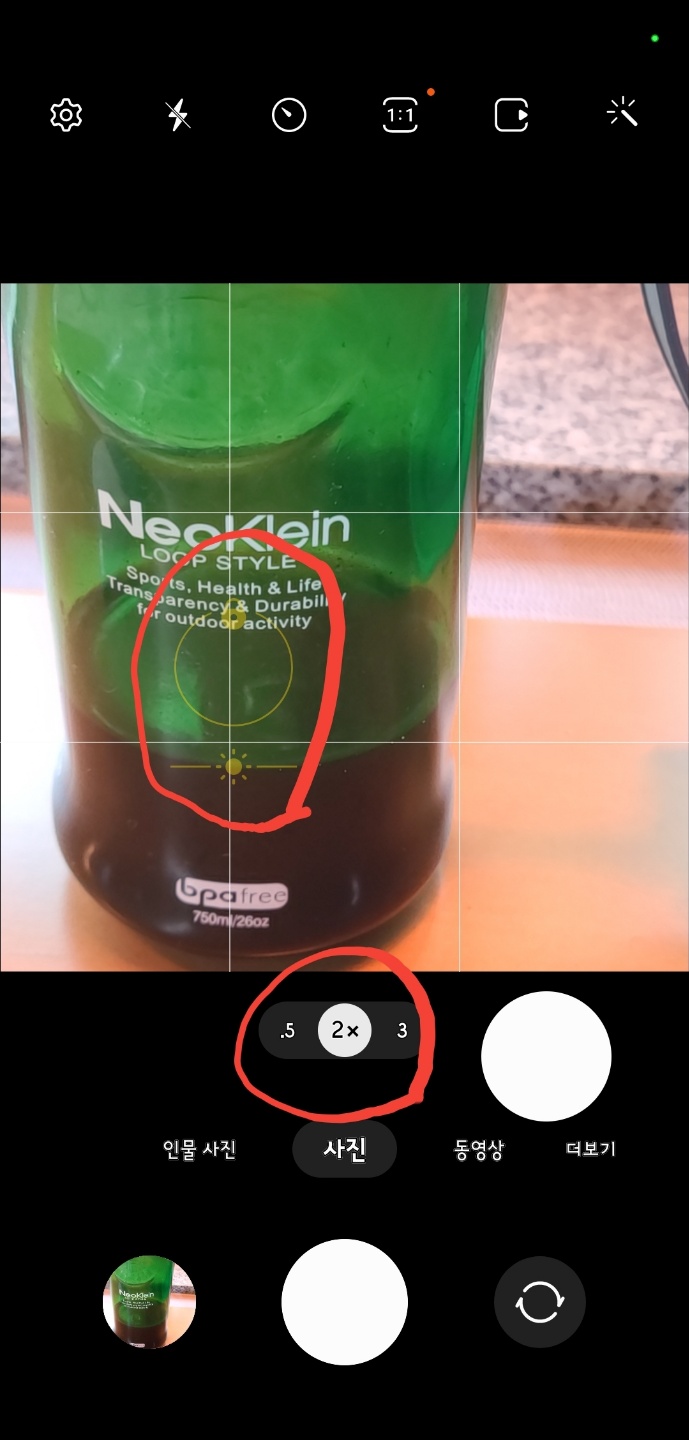사진 확대와 축소는 모니터에서 두 손가락을 이용하여 줌인, 줌아웃이 가능합니다. 또한 아래 보이는 '1×'를 롱택하여 조절도 가능합니다. 광학줌이 아니기에 구도를 정하는 용도로 사용한다 생각하면 됩니다.