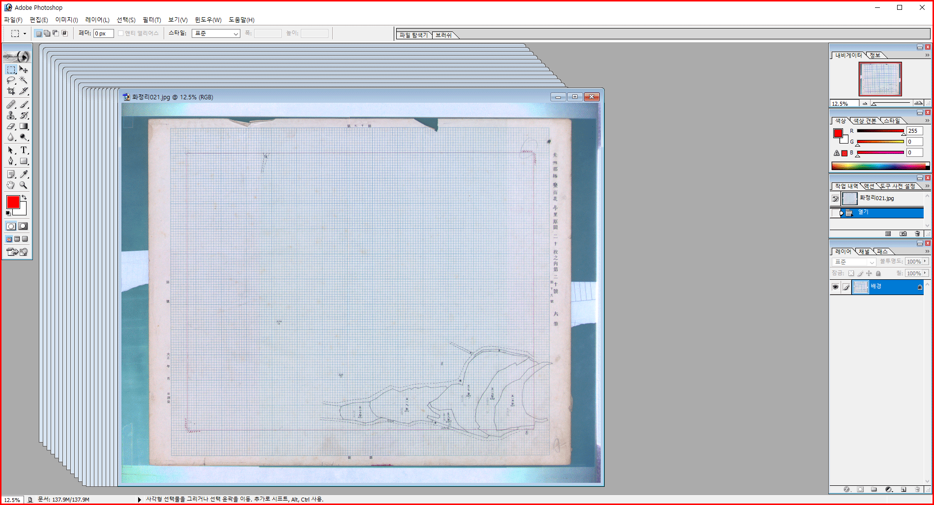 모두 20매로 된 화정리 지적도는 거대 파일의 이미지로 담겨있다. 그래픽 툴로 21장의 이미지를 불러내는데도 시간이 상당히 걸린다. 불러낸 이미지를 몇 장 살폈더니 당시 지적을 작성했던 사람들의 펜 놀림 솜씨가 느껴진다. 세필로 꼼꼼하게 모눈에 새긴 지도는 1/1200 축척이다.