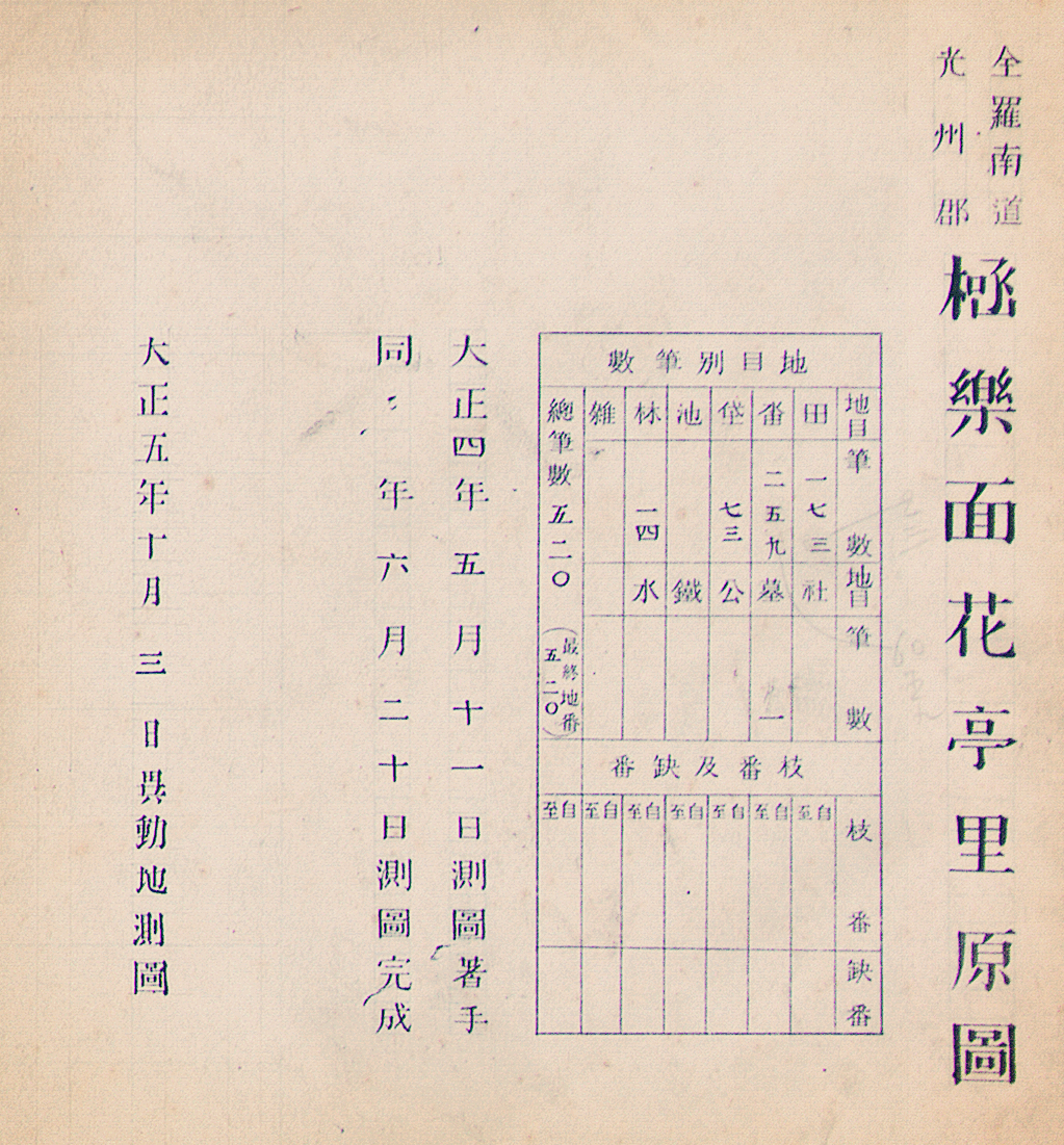1915년 이곳은 '전라남도 광주군 극락면 화정리'였다. 당시 작성된 지적공부를 찾았다. 작성된 시기가 '대정 4년 5월 11일부터 동년 6월 20일로 돼있다.
