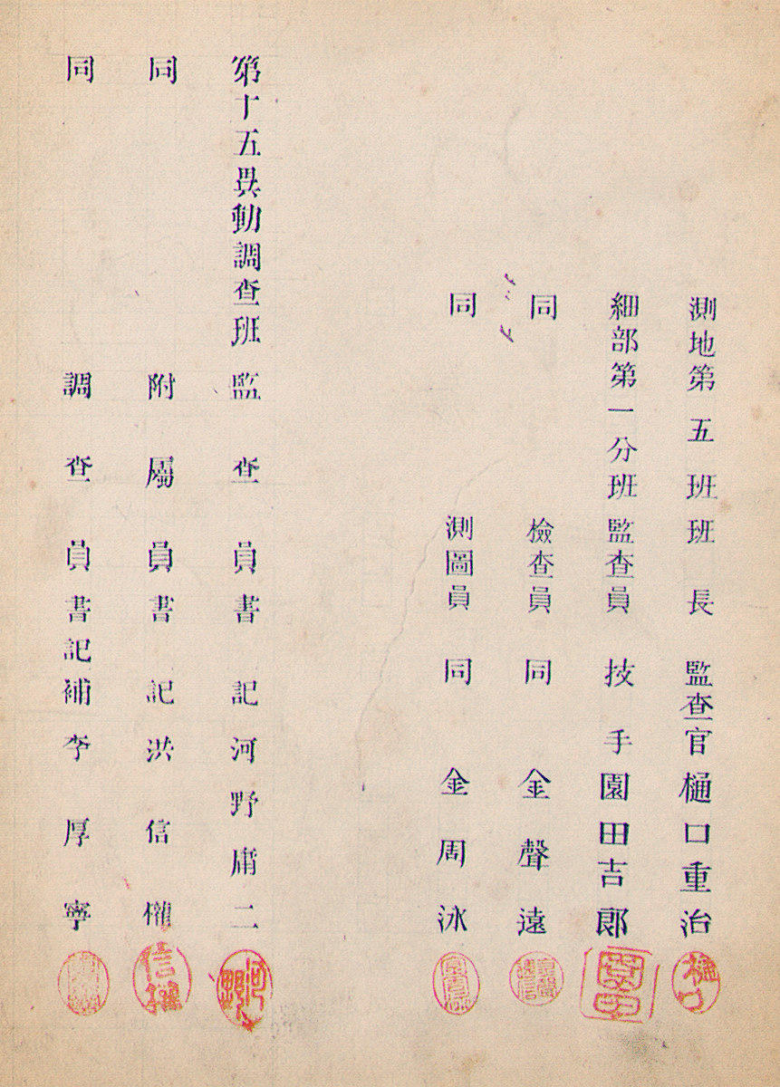 당시 작성 과정에 참여한 인력들의 명단도 선명하게 남았다. 측지 5반, 세부 제1분반 등의 조직이 만들어져 진행된 듯하다. 그리고 감사한 내력도 있다. 제15 이동조사반이 감사를 했다는 기록도 있다.
