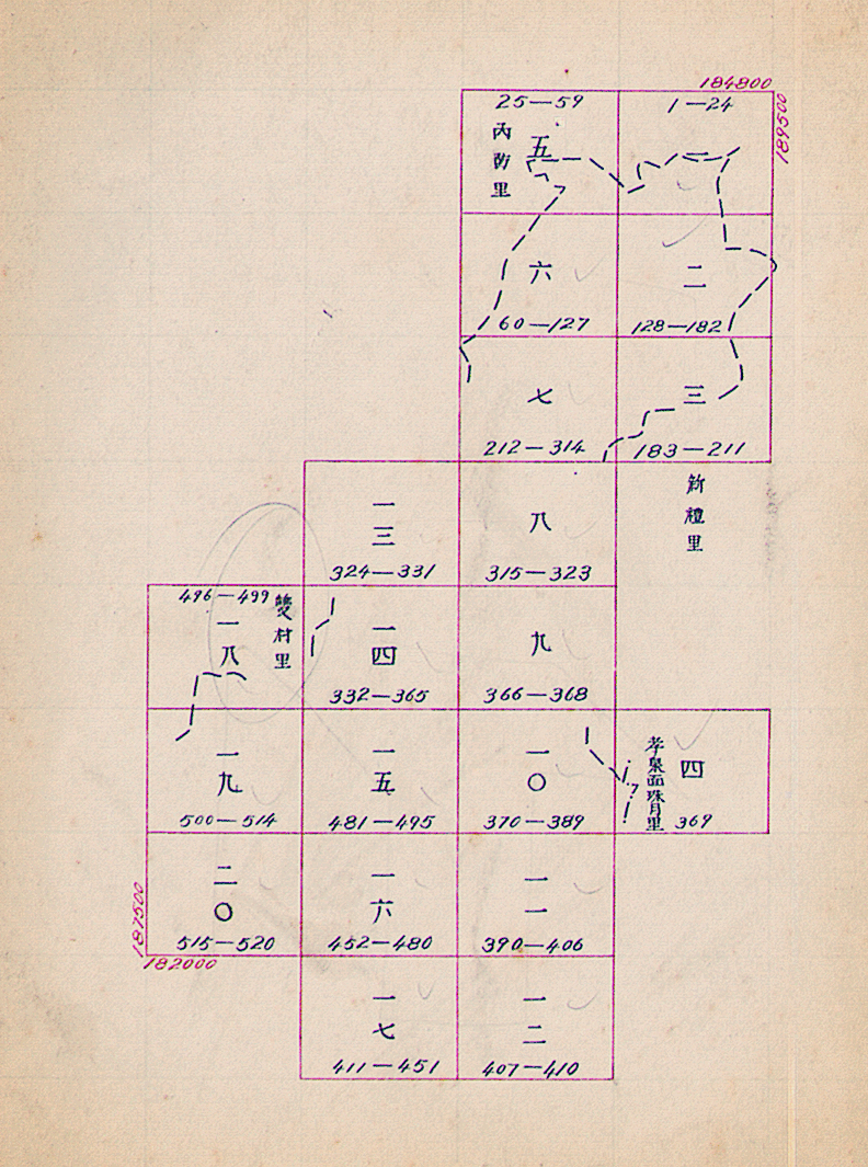 조사된 지적은 20개로 나뉘어 작성되어 있다. 그중 첫 번째에는 지번으로 1번부터 24까지라고 적혀 있다. 그렇게 각각의 목록을 먼저 작성한 후 개개 지적도가 모눈에 작성되어 있다. 그 하나를 샘플로 살펴보자.