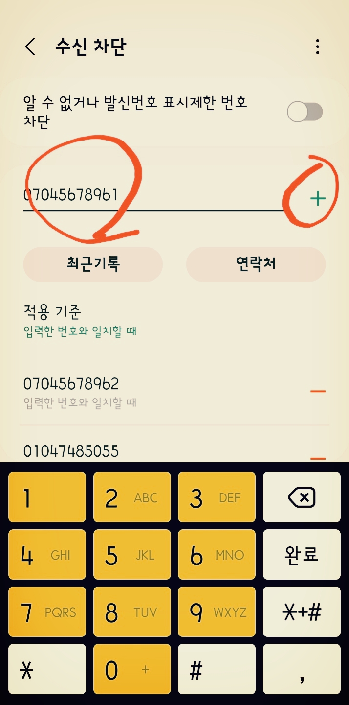 차단할 번호를 입력하고 '+'를 누릅니다. 아래 차단 번호에 차곡차곡 쌓이게 됩니다.