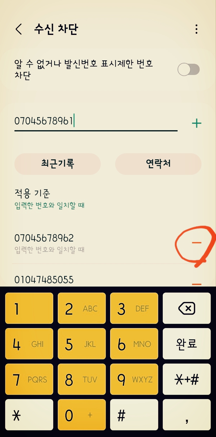 추가한 번호가 차단해서는 안 되는 번호라면 차단된 번호 오른편 '-'를 눌러 주세요. 바로 튀어나올 것입니다.