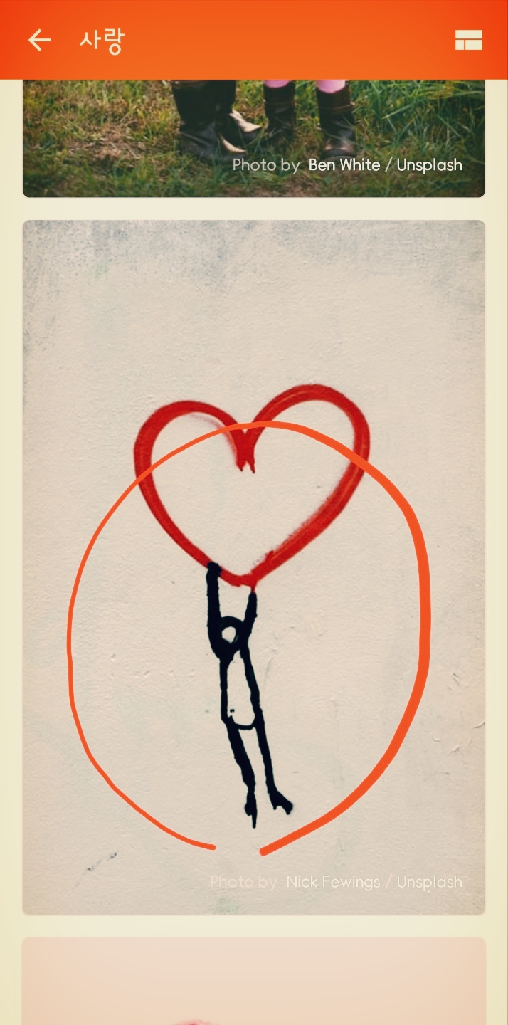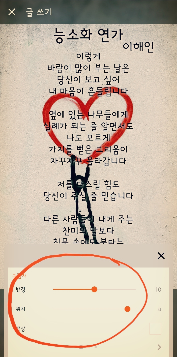 여러 범주 중에서 수녀님의 시에 어울리는 '사랑'을 선택합니다. 그중 하나, 하트를 타고 오르는 그림을 선택했습니다.