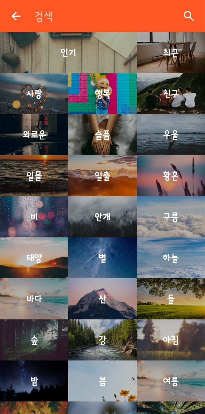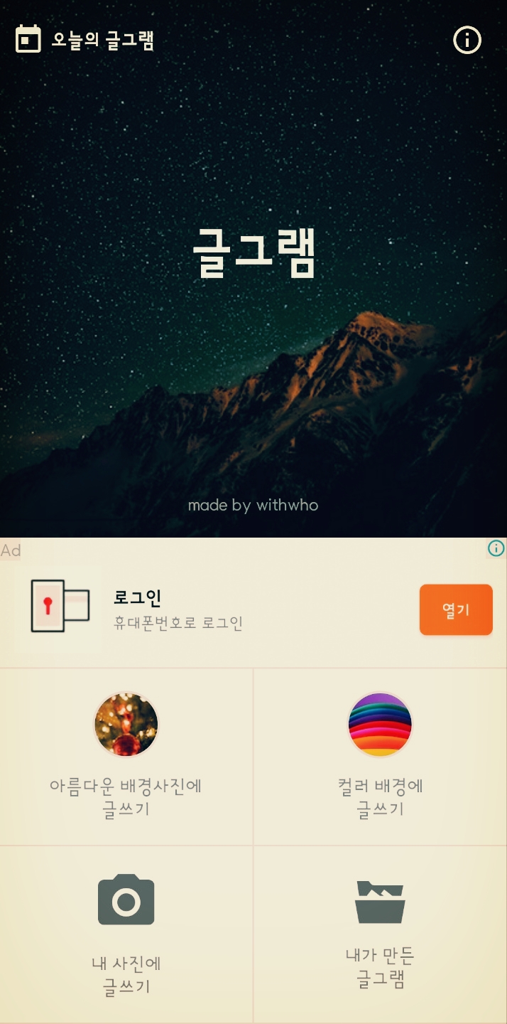 글 그램 초기 화면에서 '아름다운 배경 사진에 글쓰기'를 선택합니다. 많은 배경 사진이 종류별로 찾을 수 있습니다.
