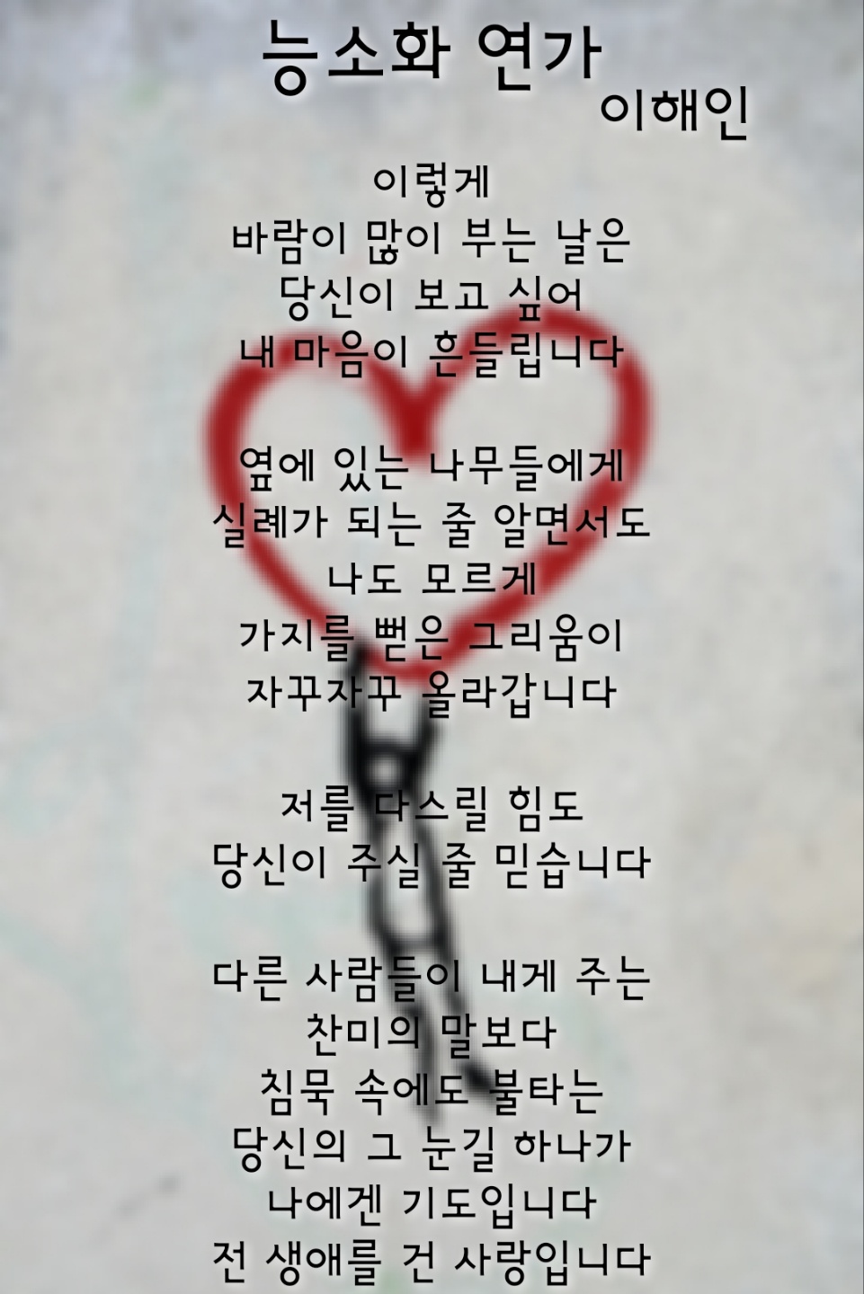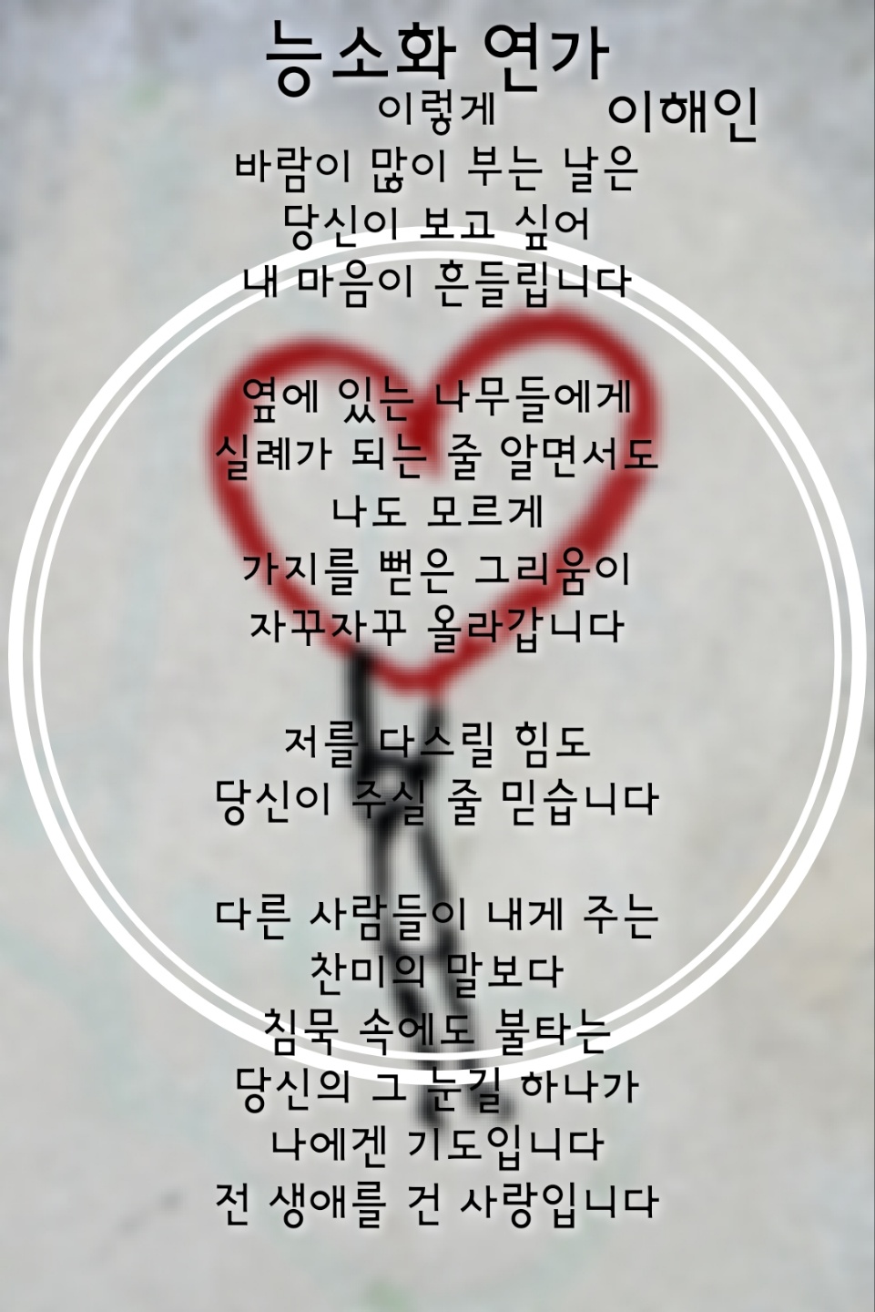 능소화가 한창일 때, 이해인 수녀님의 '능소화 연가'를 읊조립니다. 바람이 불어 흔들리는데 당신 보고 싶어 흔들린다네요. 세상 무슨 일이 있어도 님을 위해서는 감당할 수 있다는 다짐이군요. 더 나아가 옆 나무에 실례가 되는 줄 알지만 님 보고 싶어 가지를 뻗는다 했습니다.