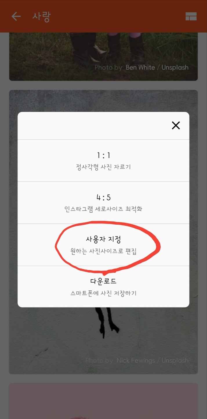 선택한 배경 사진을 어떤 사이즈로 사용할 것인가를 물어옵니다. 저는 '사용자 지정'을 택했습니다. '원본'을 택해 시의 길이를 맞추려고.