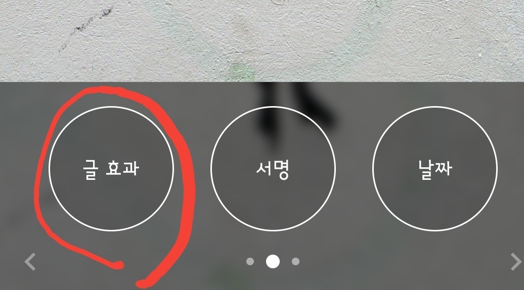 입력 후에 글꼴, 글자색, 스타일을 지정하는 것이 순서입니다. 아래 메뉴 두 번째 페이지에 '글 효과'가 있습니다. 이곳에서 배경색을 보색으로 선택하여 조절하면 글자가 입체감을 보입니다.