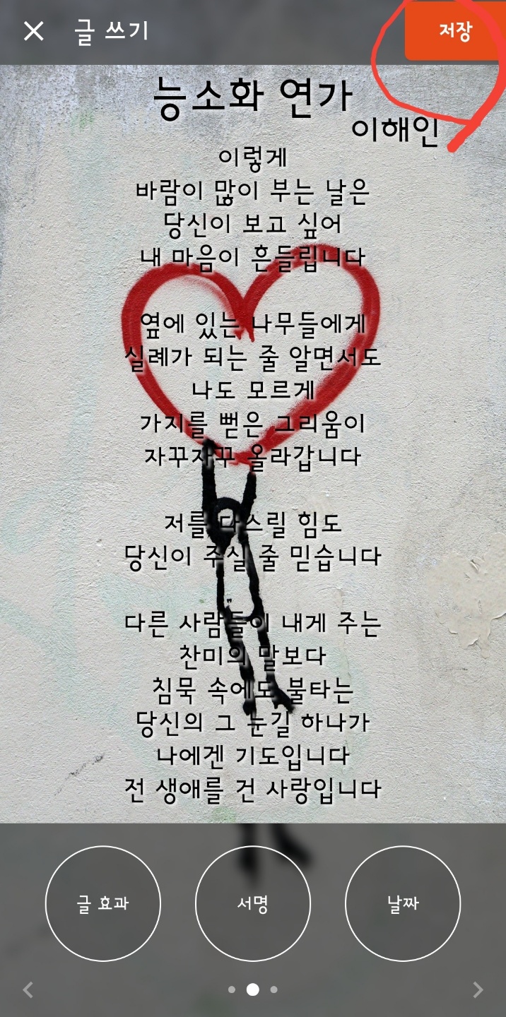 모든 효과가 적용되면 '저장'합니다. 우상단 '저장' 버튼을 누르면 다양한 공유 방법이 나옵니다. 제가 권하는 방법은 '스마트폰 저장'입니다.