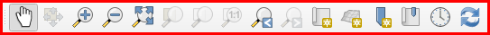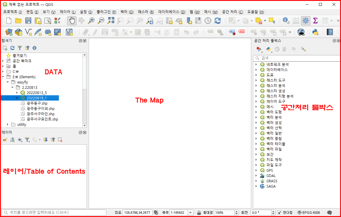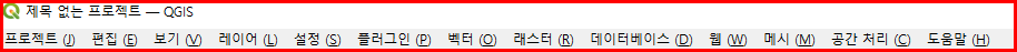 QGIS의 사용자 환경은 일반적으로 메뉴바, 툴바, 탐색기 패널, 레이어 패널, 공간 처리 툴박스를 구성하여 작업합니다.