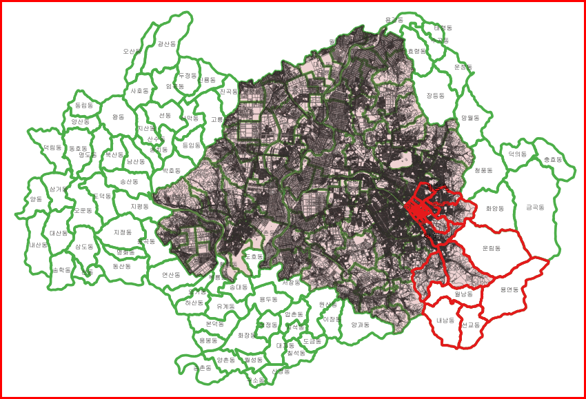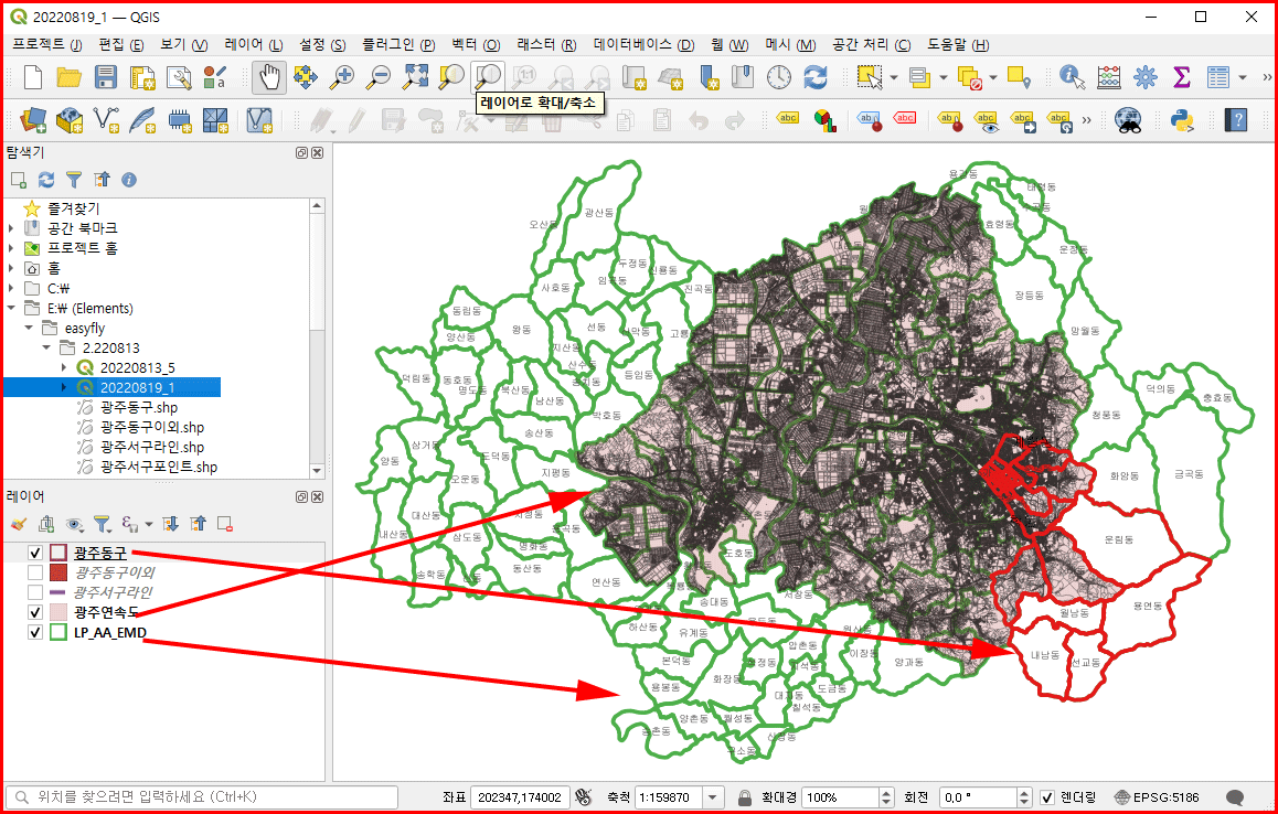 레이어에 공간데이터를 불러오면 맵창에 지도가 나옵니다.
