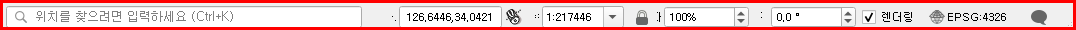 현재 맵에 관련된 정보를 보여줍니다. 맵 축척을 조정하거나 현재 맵상에서 마우스 위치를 좌표값으로 확인할 수 있으며, 프로젝트 좌표계를 보여줍니다.