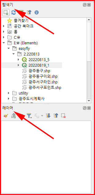 탐색기 패널은 데이터를 탐색하여 레이어에 배치할 때 유익하게 사용할 수 있는 윈도즈 탐색 창과 비슷합니다. 레이어 패널은 사용 중인 레이어를 선택 및 해제를 통해 데이터 가공을 위해 필요한 창입니다.