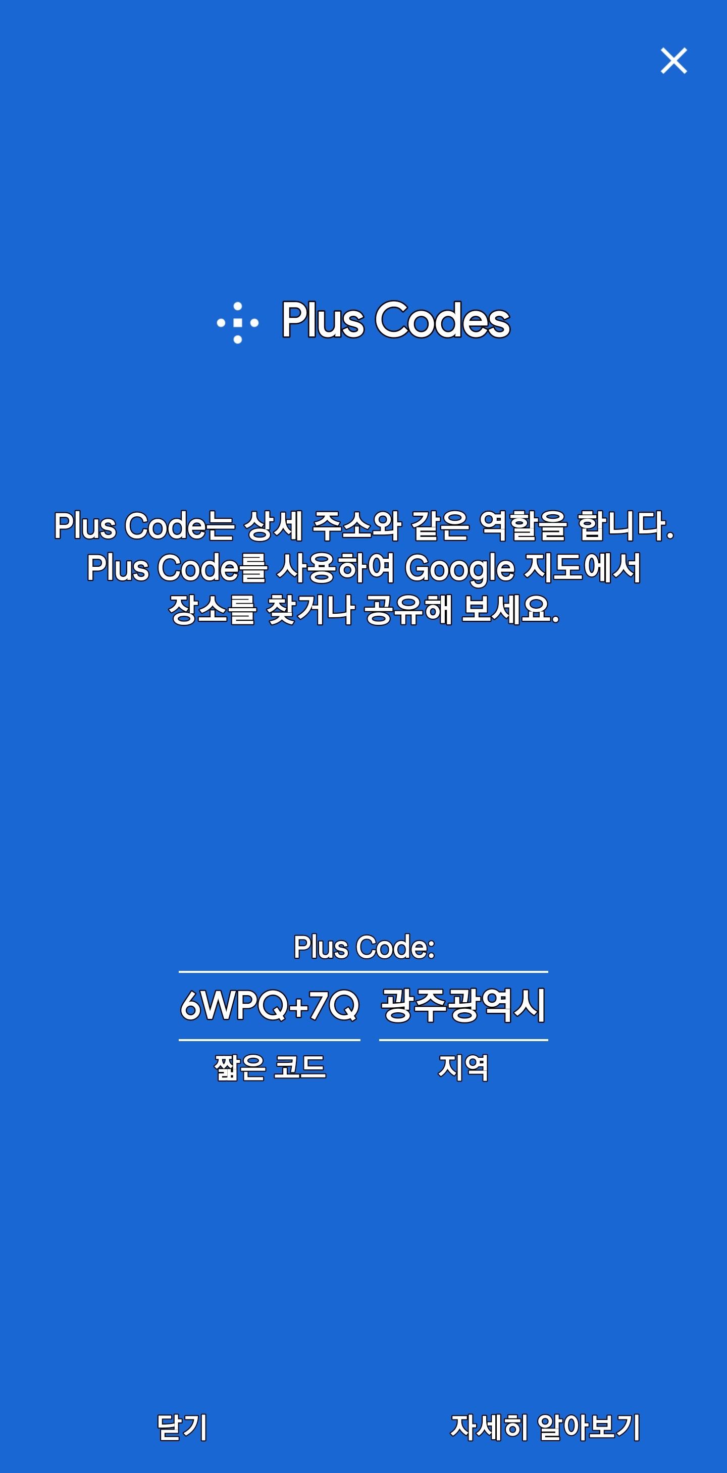 가장 정확한 검색 방법은 구글지도에서 [짧은코드, 지역이름]으로 검색해야 합니다. 물론 지역이름을 기록하지 않은 경우 지금 위치에서 가까운 위치를 지정하군요. 플러스 코드를 사용하여 배송을 받거나 응급 및 소셜 서비스에 액세스하거나 특정 위치로 사용자를 안내할 수 있습니다. 코드는 간단하므로 다른 사용자와 쉽게 공유할 수 있습니다.