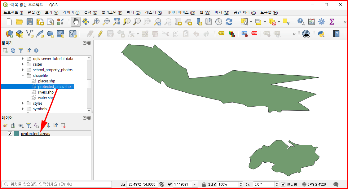 QGIS 탐색기에서 자신의 홈에 있는 'exercise_data' 폴더를 찾습니다. 그 안에 여러 폴더 가운데 'shapefile' 방에 'protected_area.shp' 파일이 있습니다. 이 파일은 벡터 파일로 남아프리카 공화국의 스왈렌담 protected area입니다. 이 파일을 레이어에 배치합니다.