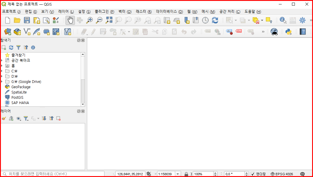 QGIS를 시작합니다. 텅 빈 새 맵이 나타납니다. '제목 없는 프로젝트'라는 이름으로.
