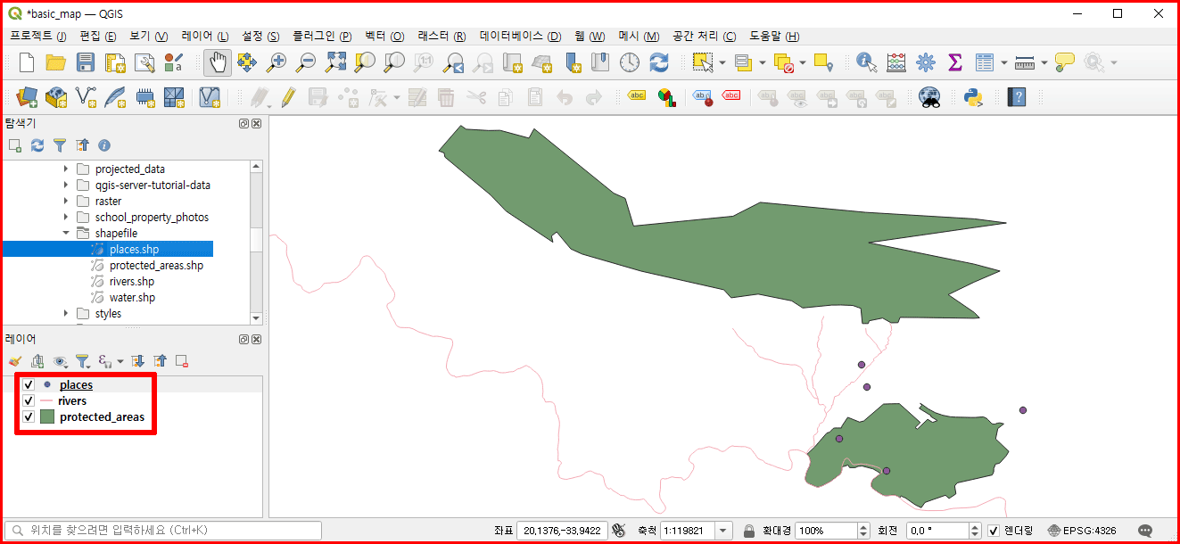 또는 메뉴(레이어)에서 '레이어 추가/벡터 레이어 추가'를 선택하고 'exercise_data/shapefile/protected_areas.shp' 선택하여 배치해도 됩니다.