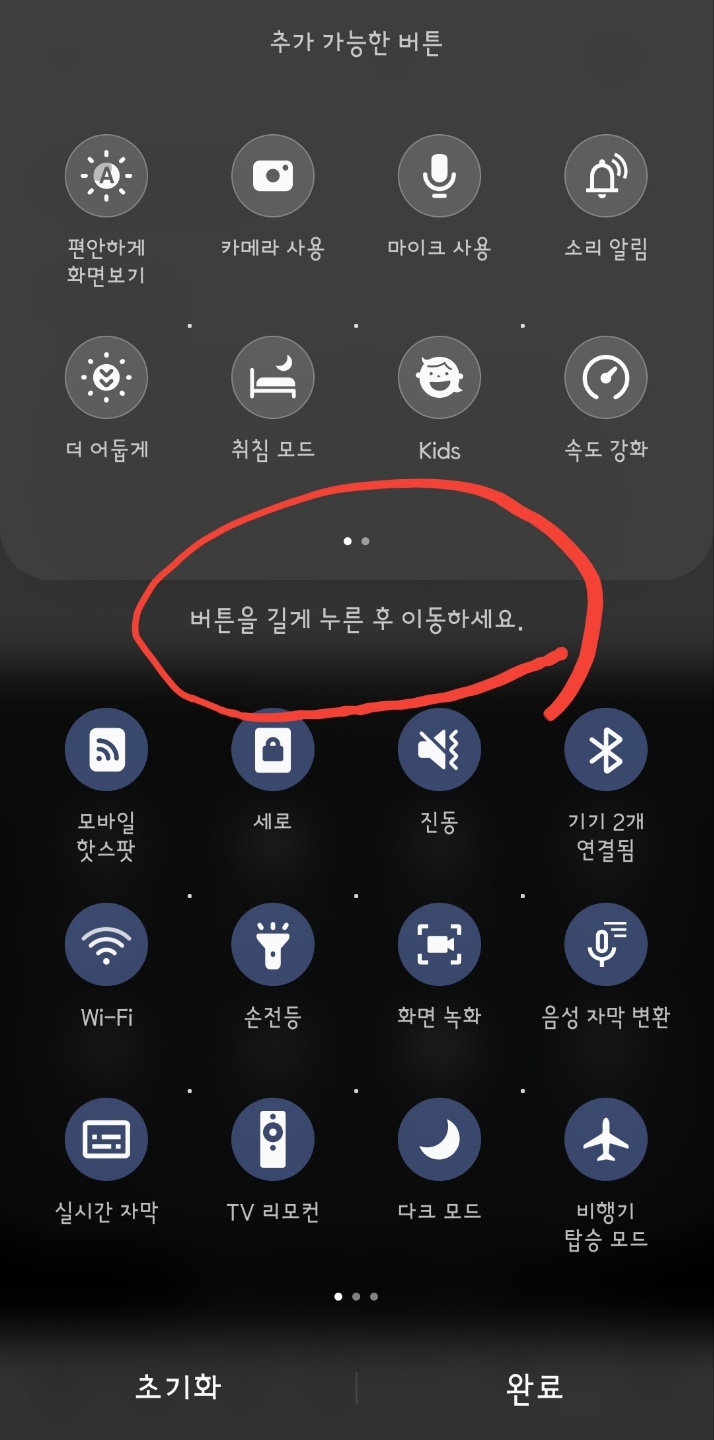 버튼을 편집하는 방법은 홈 화면에서 아이콘을 편집하는 방법과 동일합니다. 버튼을 '지압을 하듯이' 지그시 누르면 버튼을 다른 곳으로 이동할 수 있습니다. 퀵패널에 우선적으로 보이는 개수는 6개가 최대이므로 여섯 번째 안에 자신이 많이 사용하는 기능의 버튼을 배치해야 합니다. '추가 가능한 버튼'을 통해 기능을 추가할 수도 있습니다만 권장하지 않습니다. 지나치게 기능이 많으면 폰 사용이 번거로워질 수 있습니다.