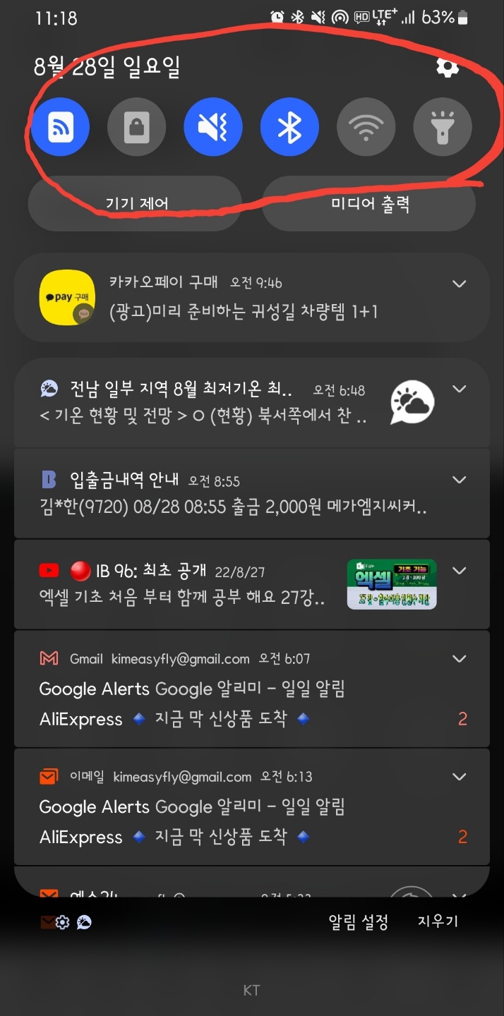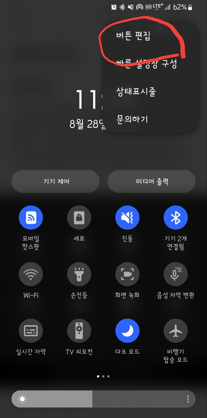 스마트폰 설정에서 중요한 기능은 '퀵 패널'에 배치해서 빠른 접근을 가능하게 합니다. 퀵 패널은 폰 상단에 있기에 폰 위쪽 가상 자리를 살짝 내리면 패널이 보입니다.