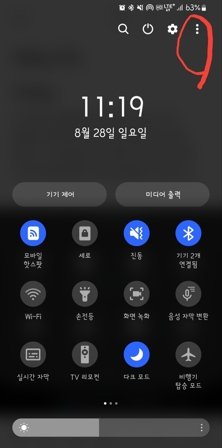 한번 더 살짝 내리면 퀵패널이 3페이지로 구성됐음을 알 수 있습니다. 오른쪽 상단에 '삼 점 더보기' 메뉴가 있습니다. 이것을 선택하면 네 개의 선택지가 보입니다.