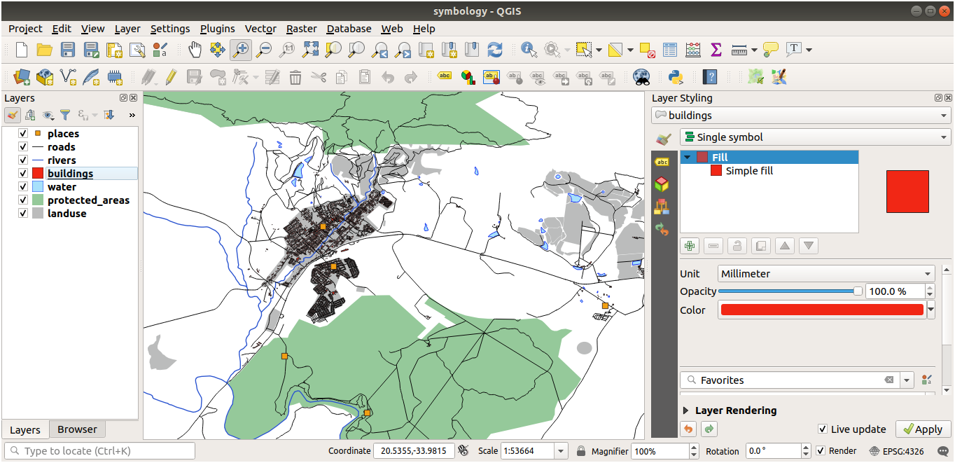 위의 방법을 사용하여 나머지 모든 도면층의 색상과 스타일을 변경하십시오. 물체에 자연스러운 색을 사용해 보세요. 예를 들어, 도로는 빨간색이나 파란색이 아니라 회색이나 검은색으로 표현하는 것이 좋겠습니다. 또한 폴리곤에 대해 다양한 채우기 스타일 및 스트로크 스타일 설정을 자유롭게 사용해 보십시오.