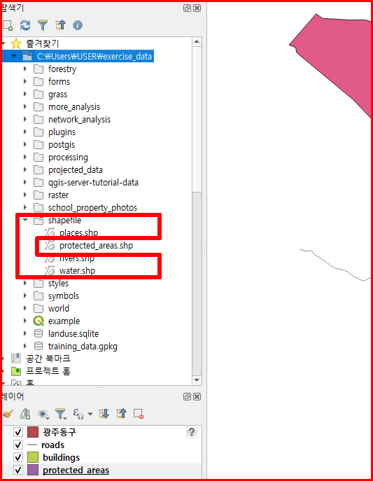 레이어를 추가하기 전에 '즐겨찾기에 추가' 하는 방법을 먼저 학습하겠습니다. 자주 사용하는 연습 파일을 모아둔 곳인 'exercise_data' 폴더를 즐겨찾기 해 두게요. 즐겨찾기에 등록하면 항상 위에서 쉽게 찾아 들어갈 수 있습니다.