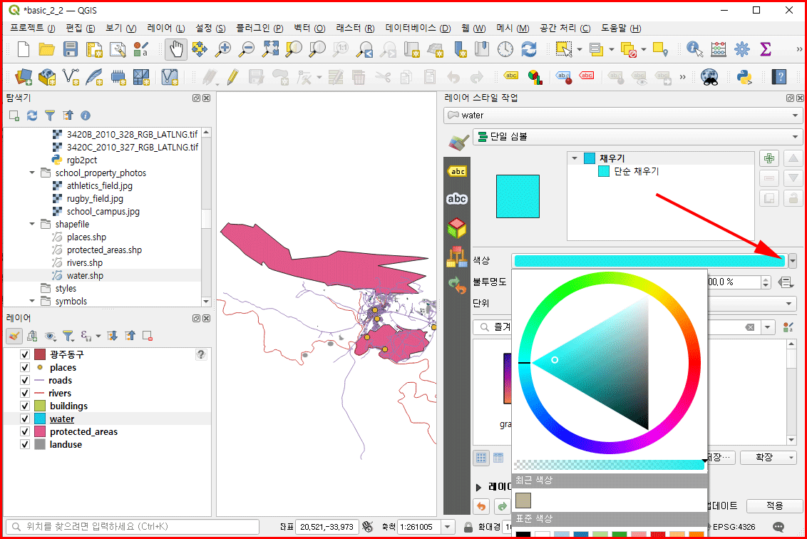 'water' 레이어의 색을 light blue로 변경합니다. 레이어 속성 대신 레이어 스타일링 화면을 사용해 보십시오.