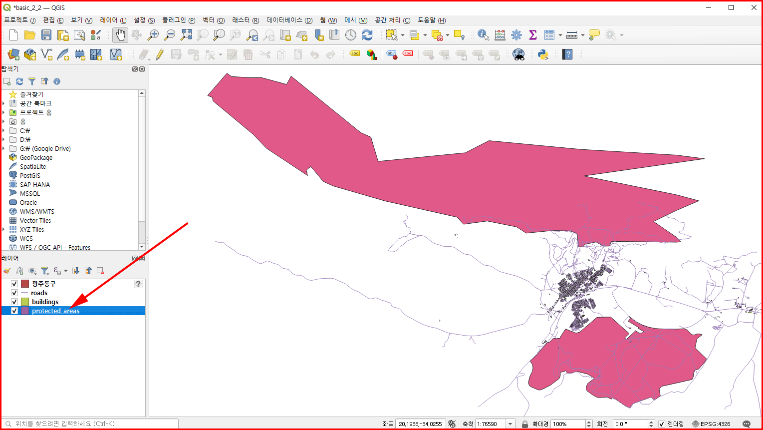 레이어의 심볼을 변경하려면 해당 레이어의 'Layer Properties'를 펼칩니다. 먼저 'landuse' 레이어 색상을 바꿔봅니다. 전 시간 강좌에서 제작했던 프로젝트 'basic_2_2.qgz' 파일을 엽니다. 이전 저장 과정의 마지막 화면이 나오기 때문에 '광주 동구' 레이어가 그대로 맵 캔버스 뷰에 보일 수 있습니다. 이 경우는 레이어 중에서 'protected_area' 레이어를 우클릭하여 스웰렌담 지역으로 확대되도록 합니다.