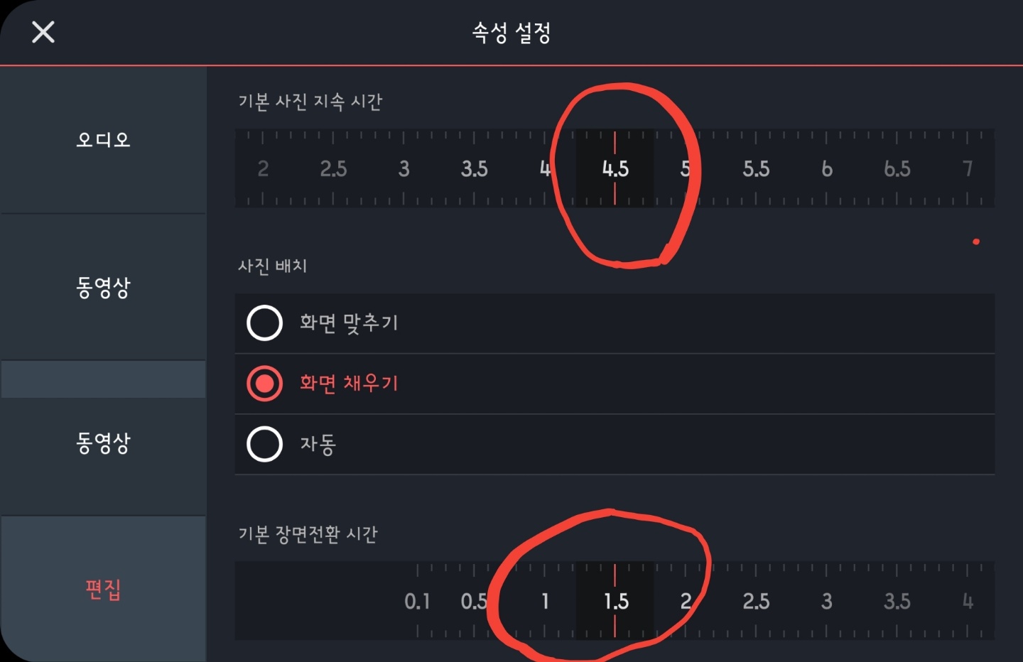 기본 설정은 '기본 사진 지속 시간'은 4.5초, 기본 장면 전환 시간'은 1.5초입니다. 저는 사진 지속 시간과 장면 전환 시간을 줄여 긴장감을 더합니다.