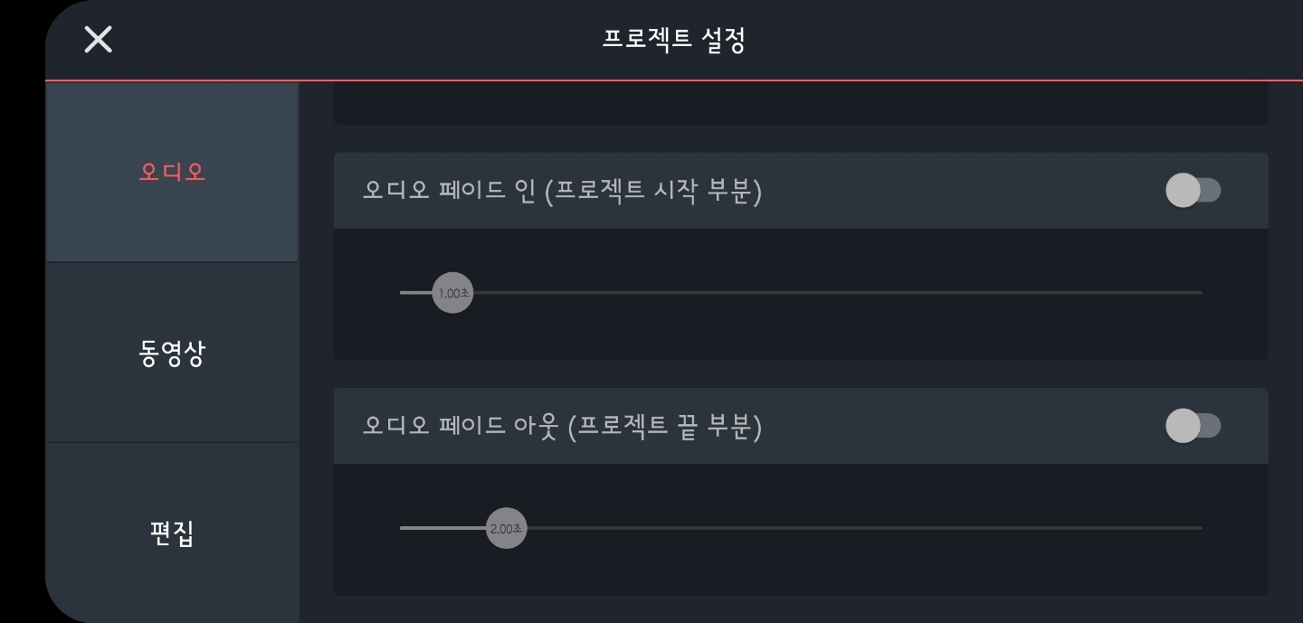 오디오에서 마스터 볼륨 자동 조정 선택 여부와 '페이드 인'과 '페이드 아웃' 등을 설정합니다. 오디오 '페이드 인'은 소리가 점점 커지면서 시작되는 것을 말합니다. 반대로 '페이드 아웃'은 사운드가 끝날 때 점점 소리가 작아지면서 끝나는 것을 의미합니다.