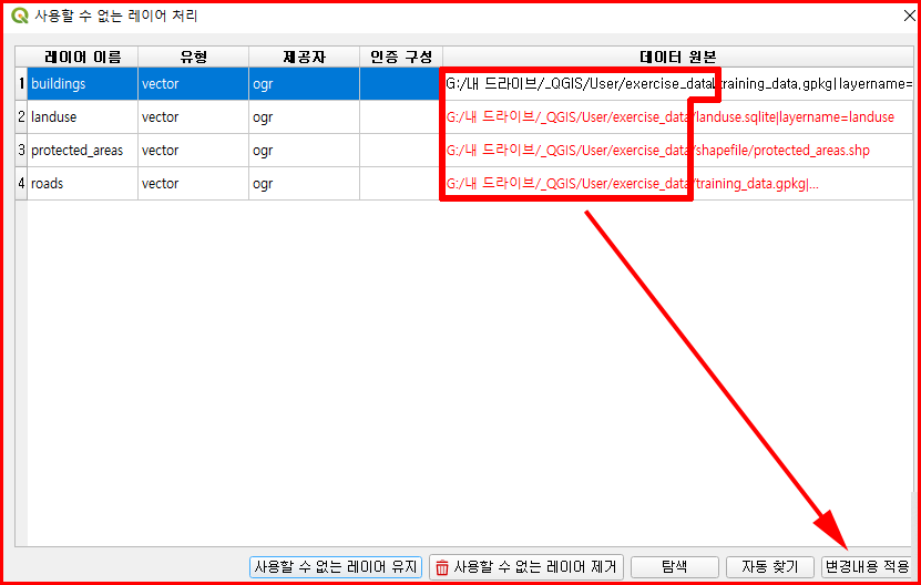 우선 전 시간에 학습했던 파일을 불러옵니다. 컴퓨터 환경이 바뀌면 레이어의 경로가 다르기 때문에 바로 불러오지 못하고 경로를 찾는 과정이 진행됩니다.