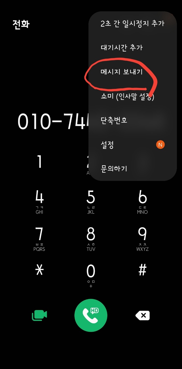 키패드에 전화번호를 입력합니다. 그리고 전화를 거는 것이 아니고 우상단 '삼 점 더보기' 메뉴를 엽니다. 아래와 같은 여러 항목 중 '메시지 보내기'를 선택하면 끝.