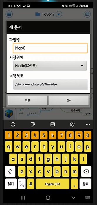 파일명을 바꿔서 작성할 수도 있습니다. 여기서는 주어진 이름 [Map0]으로 작성하겠습니다. 저장 위치는 스마트폰 메모리를 그대로 사용하겠습니다. Mobile(SD카드)는 스마트폰에 내장된 메모리도 가능하고 SD카드를 추가한 경우에는 추가한 SD카드에 저장할 수 있습니다. [저장경로]는 [ThinkWise]폴더에 저장된다는 의미입니다. [/storage/emulated/0/]까지는 내장메모리를 의미하고요.