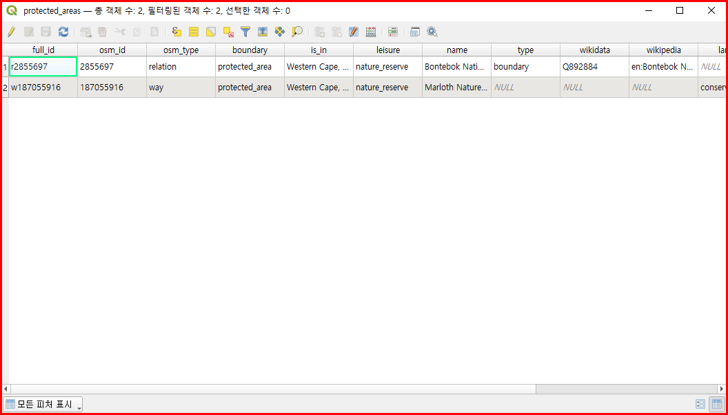 레이어 'protected_area'를 맵에 배치합니다. 그리고 레이어를 선택한 상태에서 툴바의 '속성 테이블 열기'를 클릭합니다.
