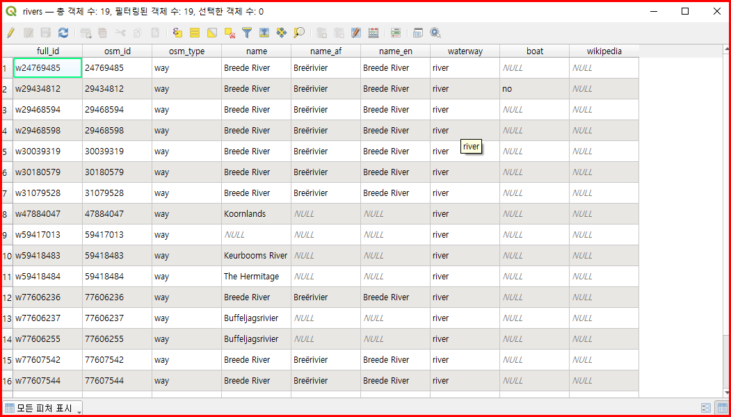 1. 'rivers'레이어에는 9개의 필드가 있습니다.
